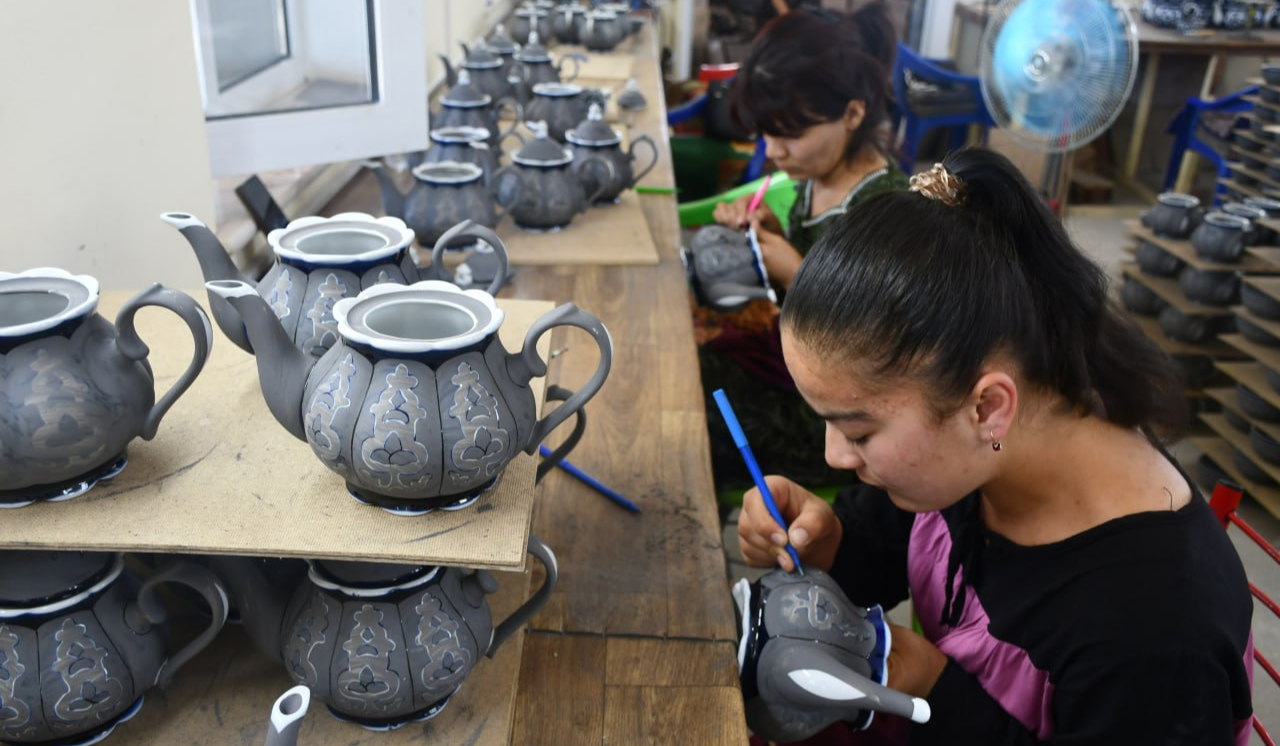 Заходим в художественный цех. Идет будничная работа. За длинным столом, уставленным чайниками, пиалами, около 30 девушек и женщин, в основном из малообеспеченных и нуждающихся в социальной защите семей из махаллей «Кухрон» и «Янгикургон». С кисточками в руках они рисуют узоры на формованных базовых заготовках. Использование трафаретов значительно повышает производительность труда. Возможности художественного цеха рассчитаны на трудоустройство 60 рисовальщиц.