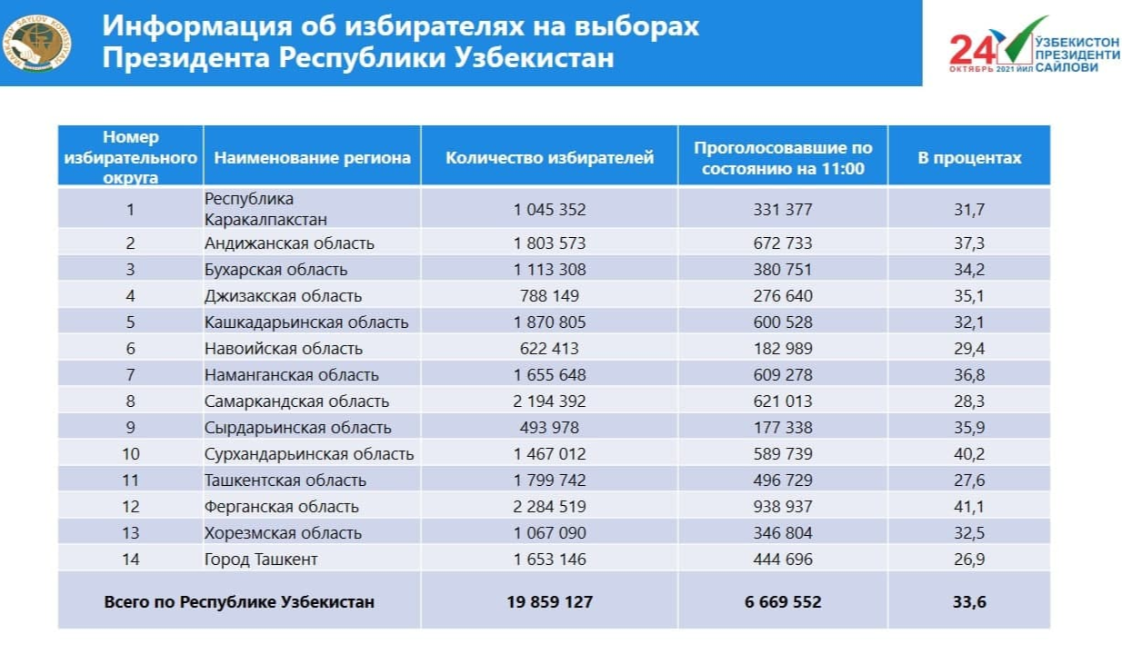 "По данным электронной системы, фиксирующей явку избирателей, на 11.00 на избирательные участки пришло 6 669 552 избирателей, или 33,6% зарегистрированных избирателей", - сказал заместитель председателя ЦИК Бахром Кучкаров. На выборах президента в 2016 году явка на 11.00 местного времени составляла 33,73% избирателей.