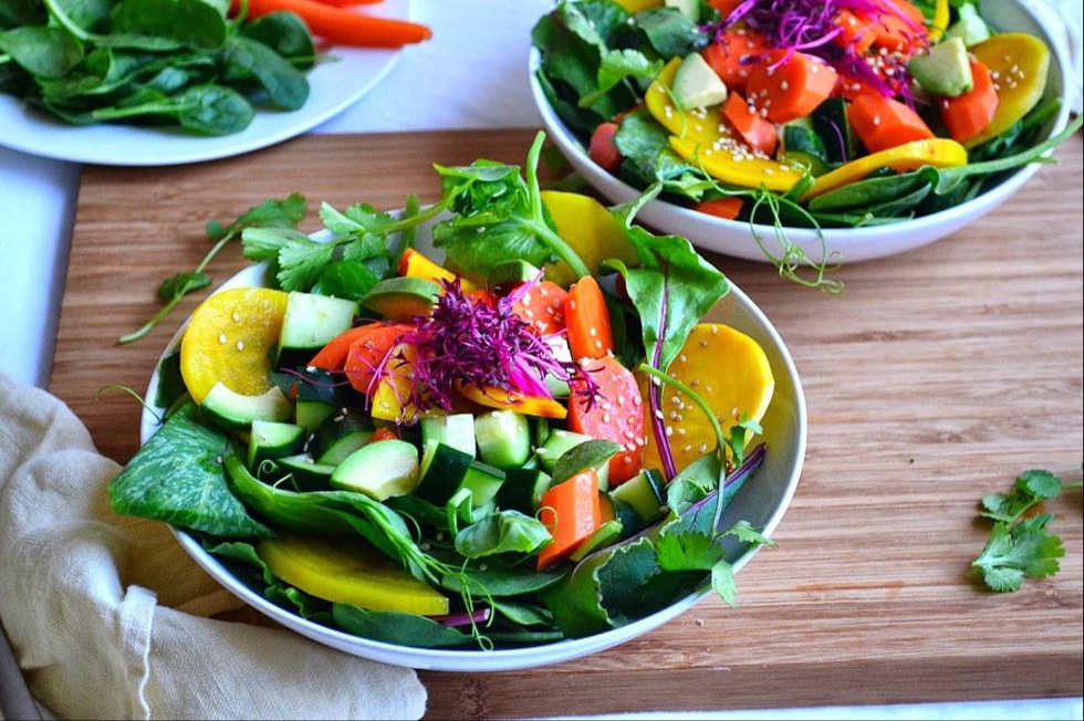 С задачей подзарядить организм полезными витаминами и минералами отлично справятся салаты: салат из корня сельдерея, моркови и кислых яблок, салат из щавеля, картофеля и зеленого горошка, салат из капусты (краснокочанной или белокочанной), моркови, кукурузы и петрушки.