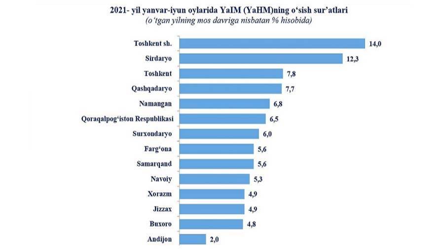 В разрезе регионов опережающие темпы роста валового регионального продукта (ВРП) отмечены в г.Ташкент (14,0 %), Сырдарьинской (12,3 %), Ташкентской (7,8 %) и Кашкадарьинской (7,7 %) областях.