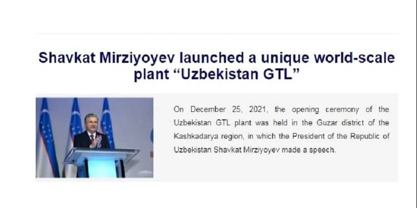 В публикации сообщается, что в Гузарском районе Кашкадарьинской области 25 декабря состоялась церемония открытия завода «Uzbekistan GTL», на которой выступил с речью Президент Шавкат Мирзиёев.
