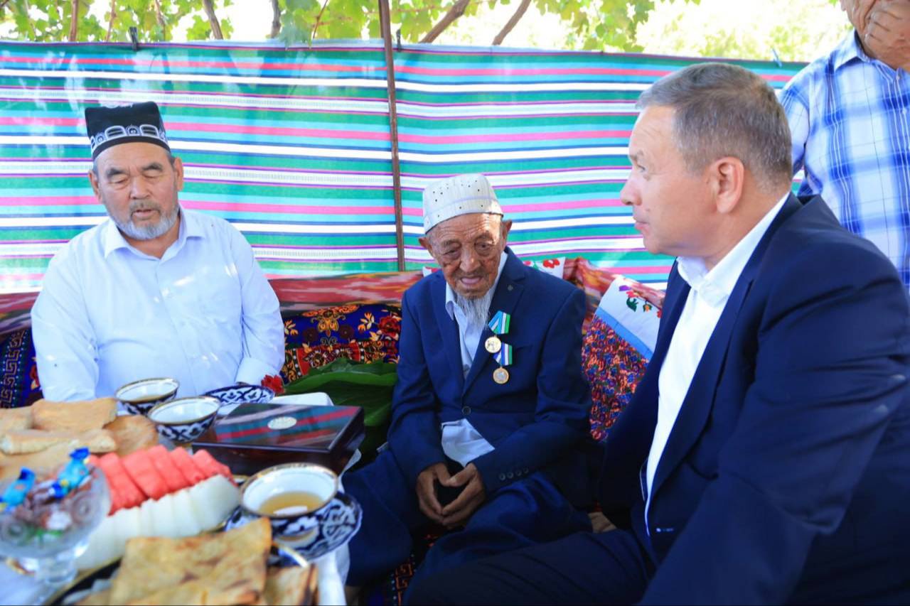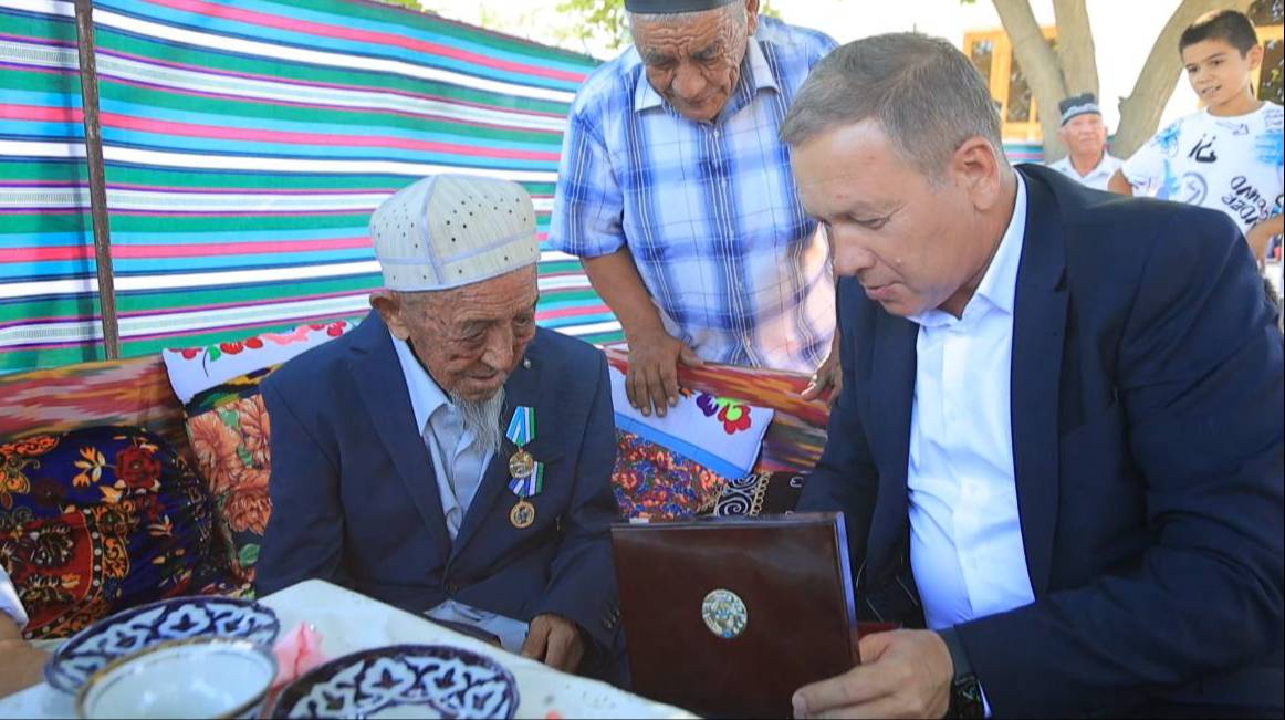 В канун Дня независимости хоким Навоийской области Нормат Турсунов посетил махаллю «Олтинсой» Хатырчинского района, чтобы поздравить Журакула-бобо от имени главы государства и вручить ему высокую награду Родины и праздничные подарки.