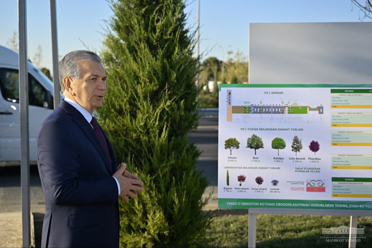 Во время нынешнего визита были рассмотрены предложения по ландшафтному дизайну улицы. В соответствии с проектом, вдоль улицы будут высажены декоративные деревья и кустарники, такие как чинара, дуб, тюльпанное дерево, катальпа, слива писардия, кипарис, индийская сирень, лаванда и сирийская роза. Перед аэропортом намечено построить два фонтана. В целом, эта территория станет частью "зеленого пояса" Ташкента.