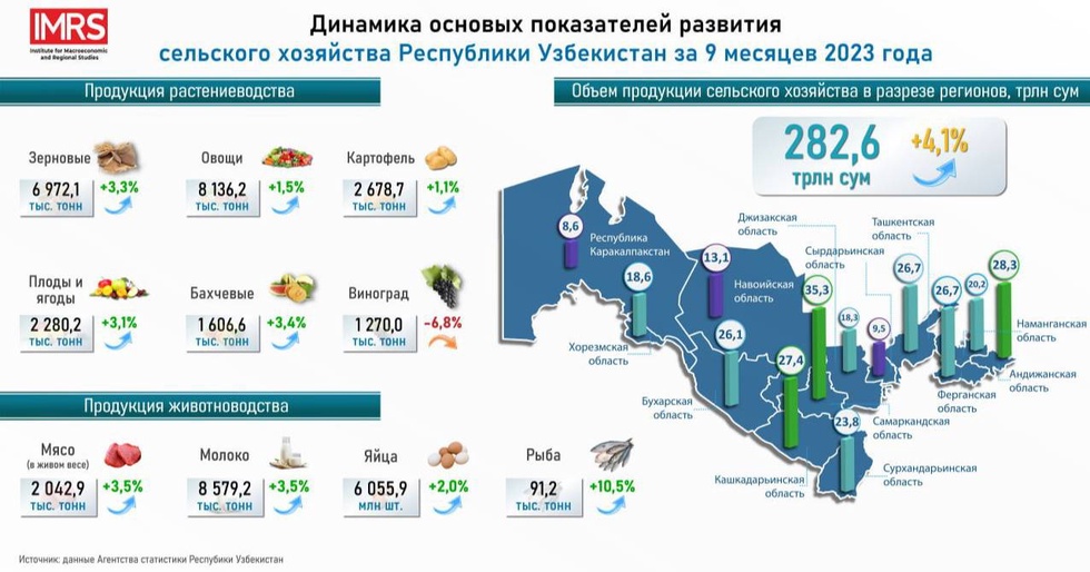 Наибольшие темпы роста валовой продукции сельского хозяйства отмечены в Сырдарьинской области - 106,9%. Среди лидеров по темпам роста также являются Сурхандарьинская (106,6%), Хорезмская (106,4%), Джизакская (105,2%) и Наманганская (105,1%) области.