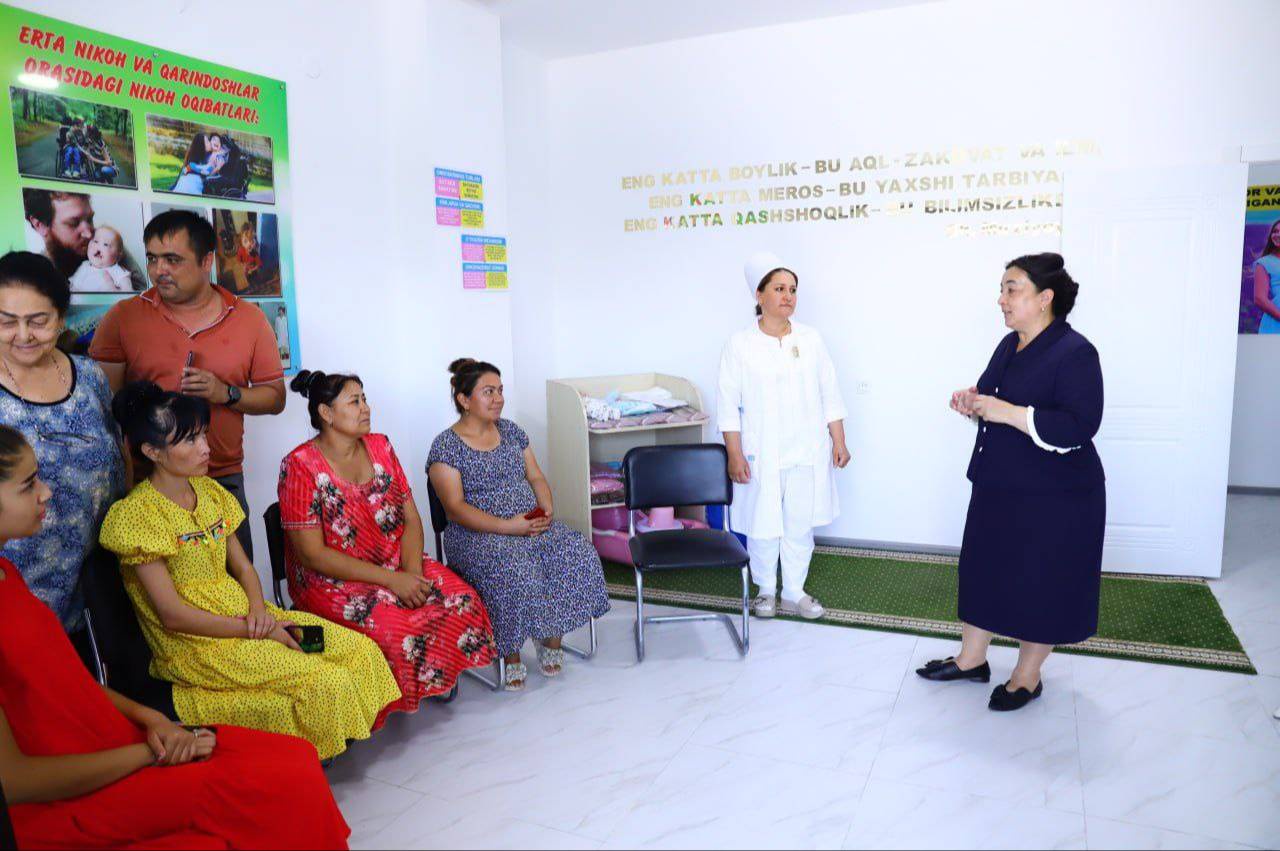 Следующим пунктом визита стала «Комната здоровой семьи», созданная в махалле «Мирсаид Бахром» Карманинского района.  З.Махкамова рассказала о задачах, которые необходимо решать в сфере охраны материнства и детства, укрепления репродуктивного здоровья, а также предложила внедрить «Комнату здоровой семьи» в других махаллях.