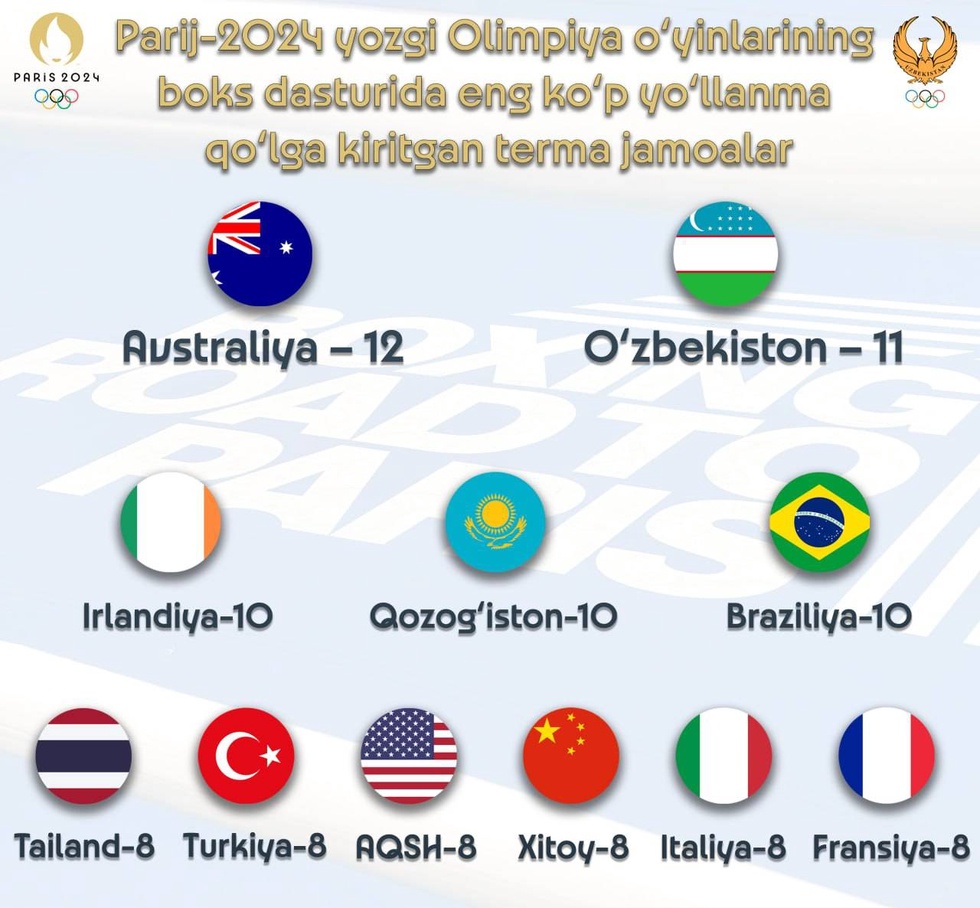Ба иттилои дафтари матбуоти КМО, аз рӯи натиҷаҳои марҳилаи интихобӣ мунтахаби Ӯзбекистон 11 роҳхат ба Бозиҳои тобистонаи олимпии Париж-2024 (7 мард ва 4 зан) ба даст овардааст. Қобили зикр аст, ки бори нахустин муштзанҳои бонувони Ӯзбекистон ба мусобиқоти асосии чаҳор сол 4 литсензия ва мунтахаби мардона севумин бор паиҳам дар маҷмӯъ соҳиби роҳхатҳои олимпӣ шуданд.