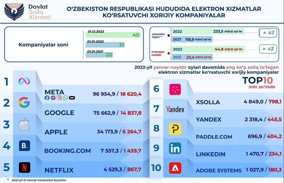 Дар 11 моҳи соли ҷорӣ ин ширкатҳои хориҷӣ 44,8 миллиард сӯм андоз супурдаанд, ки нисбат ба соли гузашта ду баробар зиёд аст. Ҳамзамон, 98 фоизи андозҳои пардохтшуда ба 10 ширкати хориҷӣ, ки хидматҳои электронӣ пешниҳод мекунанд, рост меояд: