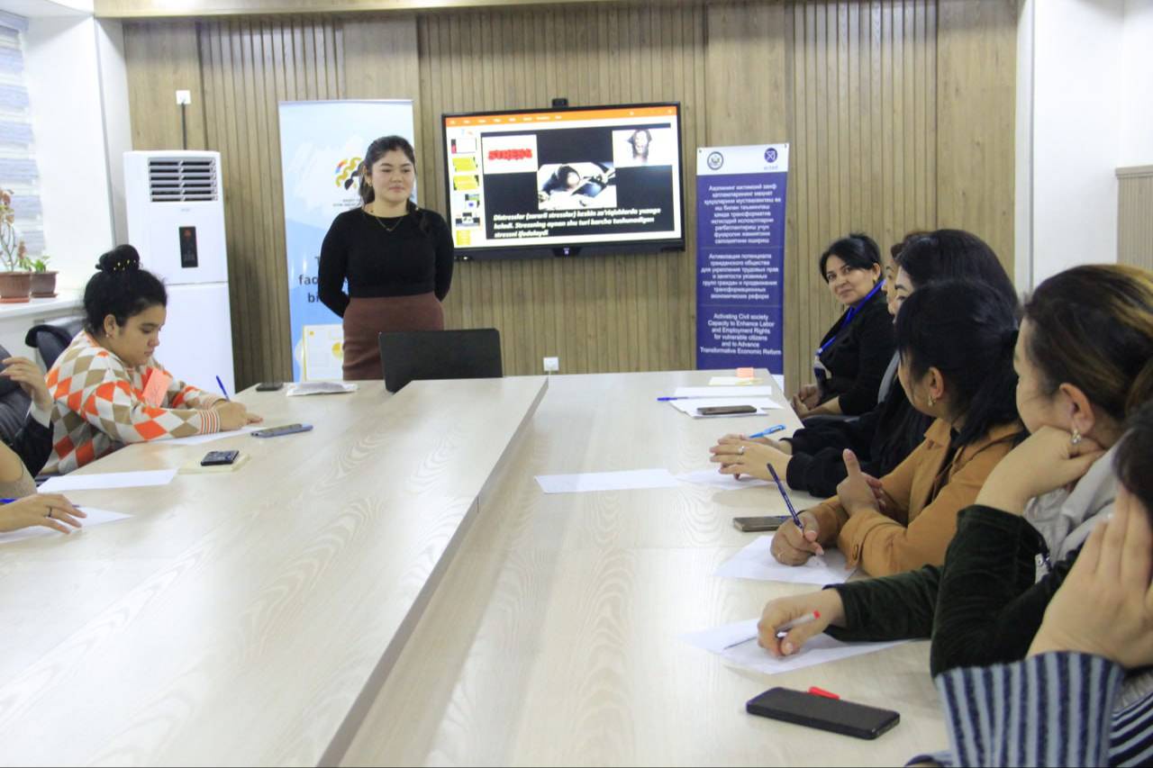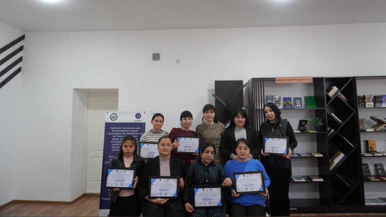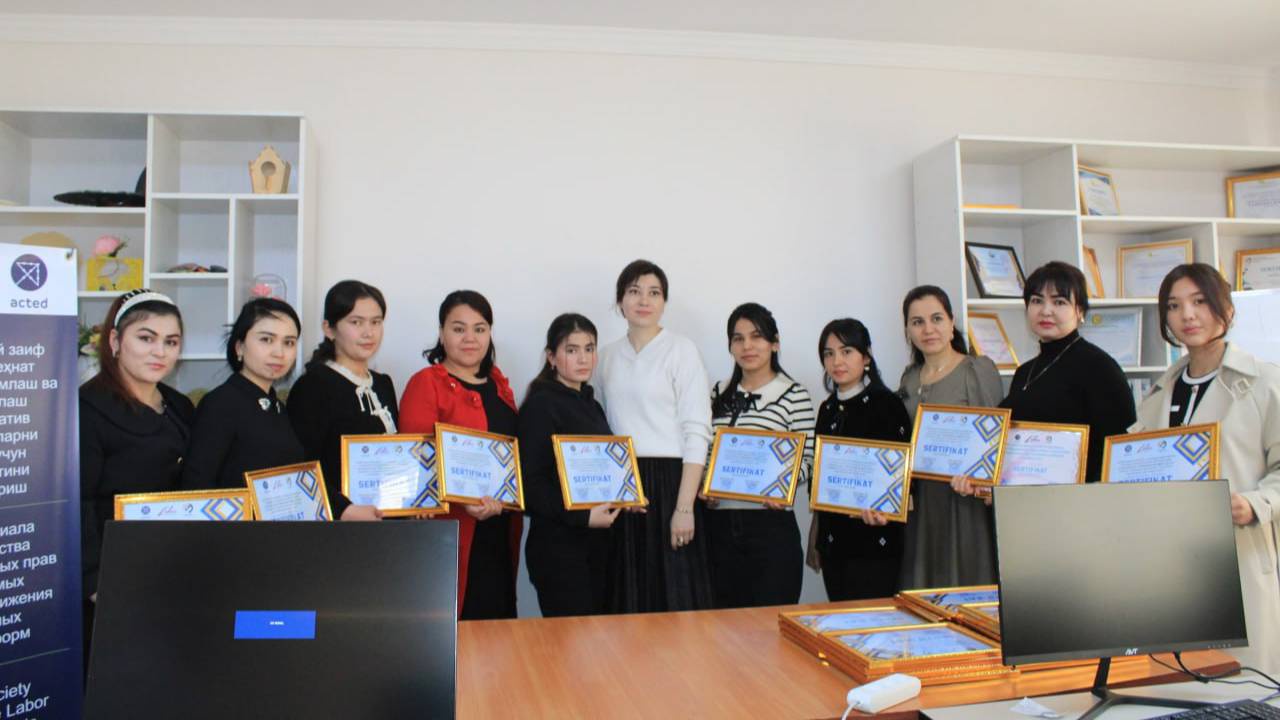 Дар доираи лоиҳаи «Қадами нав» тадқиқоти иҷтимоӣ гузаронида шуд, то ки ниёзҳои занони бекори шаҳр Навоӣ, ки ба «Дафтари занона» шомил ҳастанд, омӯхта шавад, - идома дод Г.Қуватова. - Тибқи лоиҳаи мо «Оинаи ҷомеаи занон», ки онро филиали Агентии ҳамкории техникӣ ва рушди Фаронса (ACTED) дар Ӯзбекистон маблағгузорӣ мекунад, курсҳои чормоҳа оид ба асосҳои саводнокии компютерӣ ва соҳибкорӣ оғоз шуданд, ки ҳадафашон таъмин намудани шуғли занони дохили «Дафтари занона», ки дар шаҳри Навоӣ зиндагӣ мекунанд, беҳтар кардани вазъи моддӣ ва маънавии онҳо, инчунин рушди малакаҳои касбии онҳо мебошад. 50 занон сабақ гирифтанд ва ба онҳо сертификатҳо дода шуд. Ҳамчунин дар доираи лоиҳа ба 50 зан кумаки равонӣ ва ҳуқуқӣ расонида шуд.