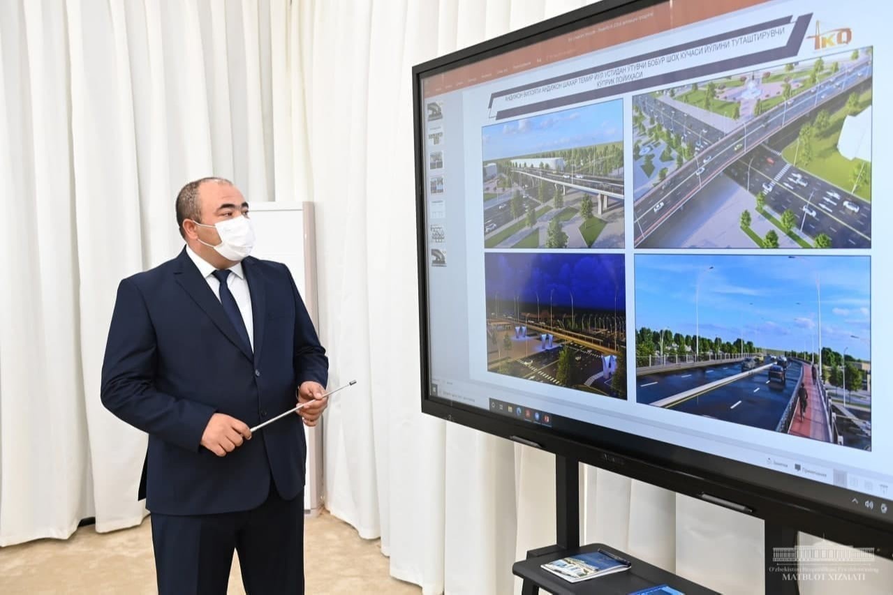 Сипас Шавкат Мирзиёев бо лоиҳаи сохтмони кӯпрук дар қад-қади кӯчаи Бобури Андиҷон шинос шуд.