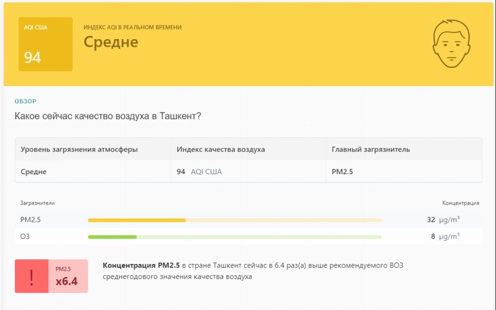 Соати 09:00 стансияи мониторинг дар пойтахти Ӯзбекистон натиҷаи 94 AQI-ро нишон дод. Консентратсияи PM2.5 аз сифати миёнаи солонаи ҳавои тавсиякардаи СУТ 6,4 маротиба зиёдтар аст.