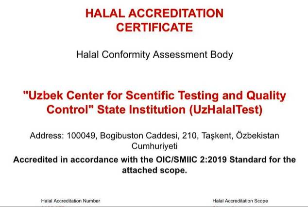 Ниҳоди сертификатсияи “Ҳалол” мувофиқи стандарти байналмилалии OIC/SMIIC 2:2019 — “Арзёбии мутобиқат: талабот ба ниҳодҳое, ки сертификатсияи Ҳалол медиҳанд” аккредитатсия гирифтааст. Ин барои ташкилотҳои Ӯзбекистон, ки дар соҳаи меъёрҳои “Ҳалол” фаъолият нишон медиҳанд, қадами нав ба шумор меравад.