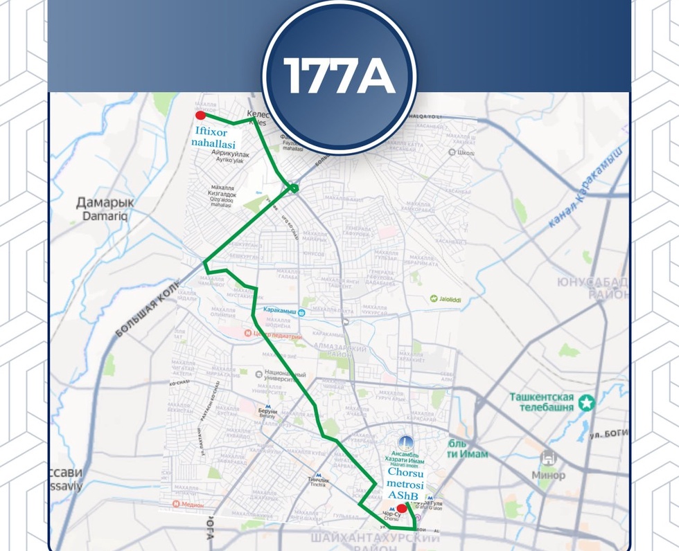 2025-yil 16-sentyabrdan boshlab 177-sonli avtobus yoʻnalishi ishga tushiriladi. Yoʻnalish Toshkent viloyatining Iftixor mahallasi bekatidan poytaxtdagi Chorsu metrosi ASHBgacha qatnaydi.