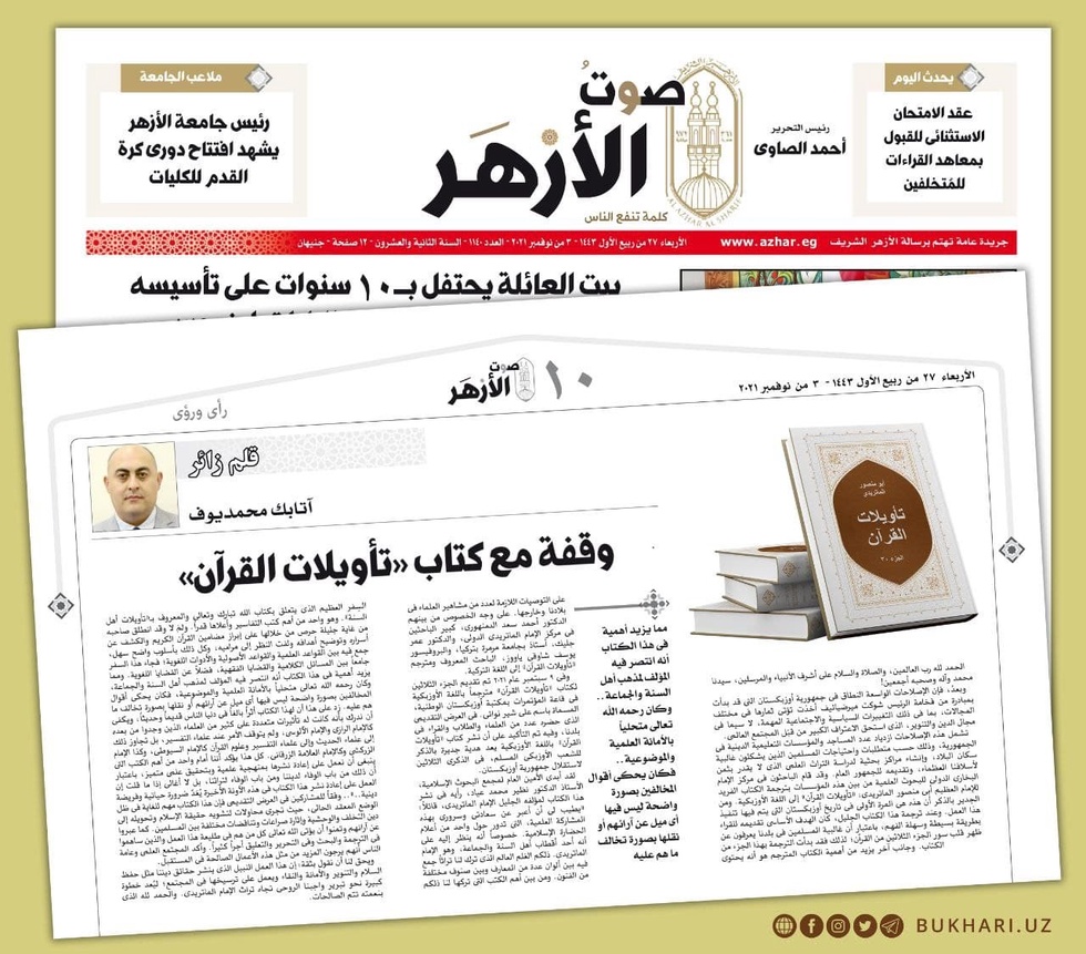 Misr Arab Respublikasidagi Al-Azhar universitetining “Al-Azhar ovozi” gazetasi 2021-yil 3-noyabrda Imom Buxoriy xalkaro ilmiy- tadqiqot markazi direktori o'rinbosari O.Muhammadiyevning “Ta'vilot al-Qur'on" asari bo'yicha yana bir muhim tadqiqot” nomli maqolasini e'lon qildi.
