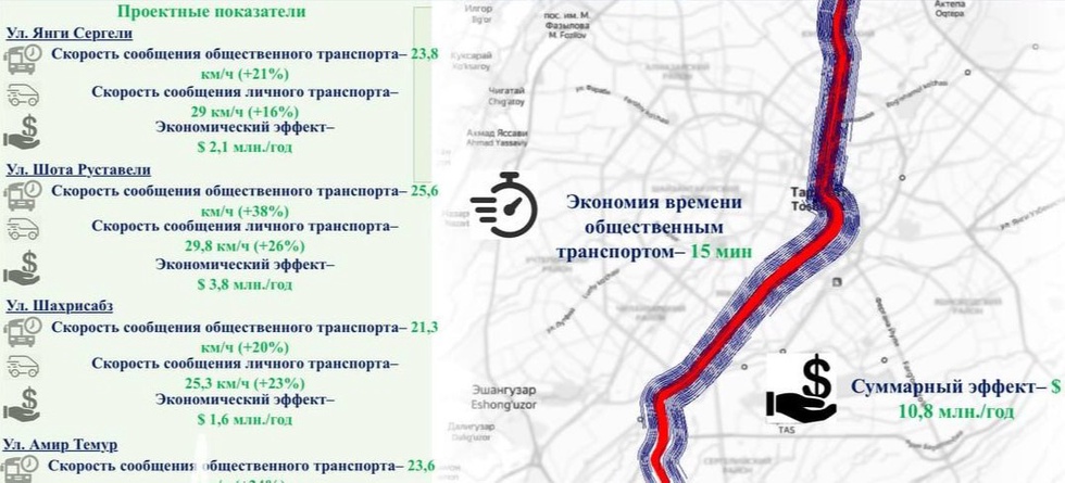 Mazkur kelishuv doirasida oʻrtacha 50 million AQSH dollariga teng boʻlgan ishlarning birinchi bosqichi Shota Rustaveli koʻchasini kompleks qayta qurish, shuningdek, Amir Temur xiyoboni, Shahrisabz koʻchasi va Olmazor tumanida joylashgan boshqa muhim uchastkalarni yangilashni oʻz ichiga oladi. Yuqorida keltirilgan taqdimot lavhasida bu ishlarning bir qismi koʻrsatilgan.
