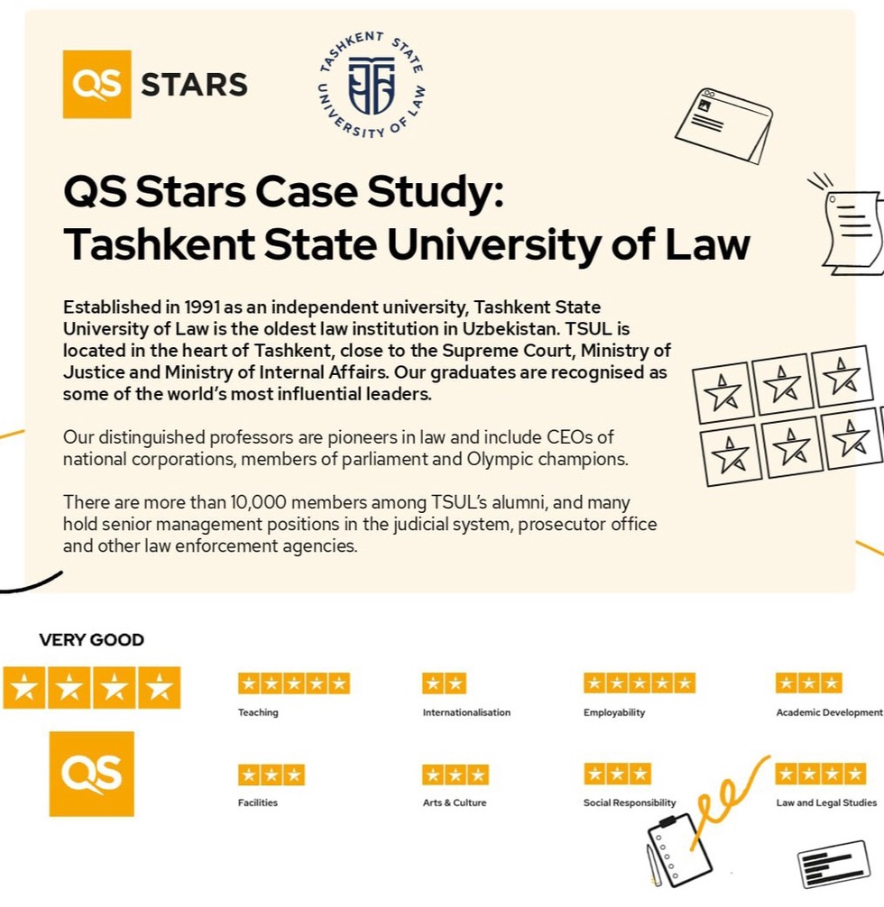 QS tomonidan TDYU va uning xalqaro reytinglardagi muvaffaqiyatlari, QS Stars xalqaro reytingidagi yutuqlari va uning universitet brendiga ta’siri bo‘yicha maqola tayyorlanib, turli veb saytlarda e’lon qilindi. Ularda QS Stars tomonidan Toshkent davlat yuridik universitetining ta’lim sifati (Teaching) va bitiruvchilarni ish bilan ta’minlanganlik darajasi (Employability) yo‘nalishi bo‘yicha jahonda 5 yulduzli universitet sifatida e’tirof etilishi juda katta natija ekani alohida ta’kidlanib, TDYU tajribasi dunyo universitetlariga namuna bo‘lgani qayd etildi.