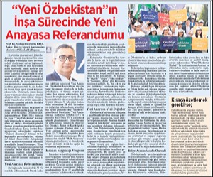Siyosatshunoslik doktori, professor, Anqara inqirozlarni oʻrganish va siyosiy tadqiqotlar markazining rahbari Sayfiddin Erol qalamiga mansub ushbu salmoqli maqolada 30-aprelda boʻlib oʻtadigan navbatdagi referendumda oʻzbek xalqining hukmiga havola etiladigan Yangi Konstitutsiya Oʻzbekistondagi islohotlar jarayonining huquqiy asosini yaratishiga hamda xalqchil siyosiy islohotlarning eng muhim hujjatiga aylanishiga ishonch bildirilgan.