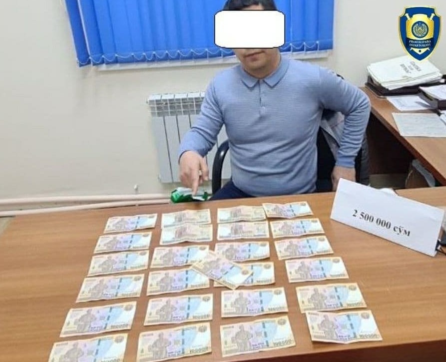 Bosh prokuratura huzuridagi Departamentning Yashnobod tuman boʻlimi tomonidan fuqarolarning huquq va manfaatlarini himoya qilish yuzasidan oʻtkazilgan tezkor tadbirda, “Yashnobod tumangaz” taʼminoti boʻlimining “Aholi isteʼmolchilar bilan ishlash” xizmati boshligʻi F.X. fuqaro B.ning xonadonidagi gaz sarfi qarzdorligi uchun hisoblangan 4 mln soʻm penyani qayta hisob-kitob qilish orqali yoʻq qilib berish evaziga pora talab qilib, oʻz xizmat xonasida 2,5 mln soʻmni olgan vaqtida ashyoviy dalillar bilan ushlangan.