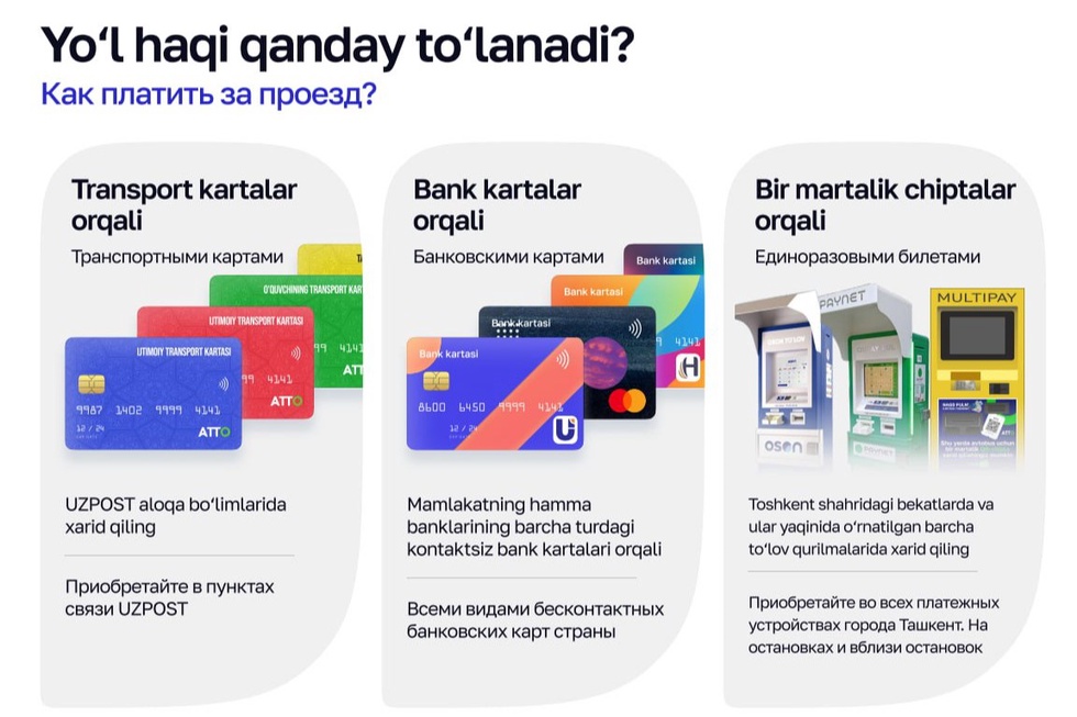 Naqd pul orqali avtobuslarda harakatlanish uchun Toshkent shahridagi bekatlarda va ular yaqinida o‘rnatilgan barcha to‘lov qurilmalari, ya’ni Paynet, MultiPay va Oson infokioskalari orqali bir martalik chipta xarid qilish kerak bo‘ladi.