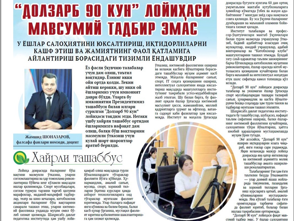 Yoz fasli oʻquvchiyu talabalar uchun dam olish, taʼtil vaqtidir. Yozning ikki oyi ortda qoldi. Lekin, aytish kerakki, shu ikki oy yoshlarimiz uchun imkoniyat davri boʻldi. Ularga bu imkoniyatni Prezidentimiz tashabbusi bilan ilgari surilgan “Dolzarb 90 kun” loyihasi taqdim etdi. Negaki, ushbu xayrli tashabbus ortidan yoshlarimizga nafaqat dam olish, balki boʻsh vaqtlarini mazmunli oʻtkazish uchun qulay shart-sharoitlar yaratib berildi.