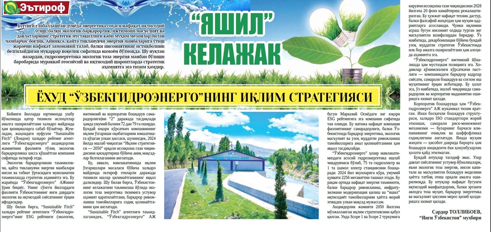 Shu bilan birga, “Sustainable Fitch” xalqaro reyting agentligi “Oʻzbekgidroenergo”ning ESG reytingi (ekologik, ijtimoiy va korporativ boshqaruv samaradorligi)ni “2” darajada tasdiqladi hamda umumiy ballini 72 dan 79 ga oshirdi. Bunday yuqori koʻrsatkich kompaniyaning iqlim oʻzgarishi oqibatlarini yumshatishga qoʻshgan ulkan hissasi, shuningdek, 2024-yilda ishlab chiqilgan “Iqlim strategiyasi – 2050” orqali issiqxona gazi chiqindisini qisqartirish boʻyicha aniq maqsadlar belgilaganini anglatadi.