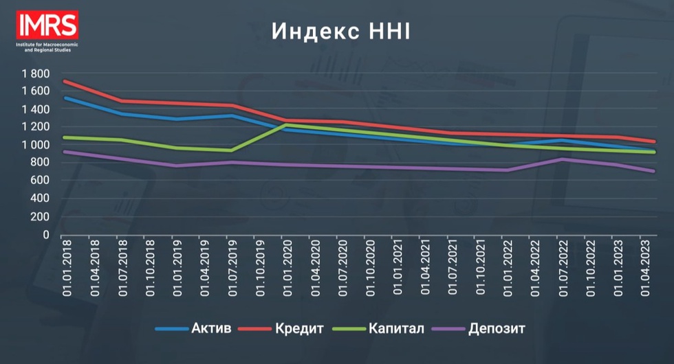 Aktivlar. 2023-yilning 1-may holatiga koʻra, aktivlar boʻyicha hisoblangan HHI indeksi 927 ni tashkil qildi va 2018-yilning 1-yanvar holatidagiga (1520)  nisbatan 593 birlikka kamaydi. Bu esa oʻz navbatida, respublikamizda bank tizimi oʻrtacha konsentratsiyalashgan darajadan raqobatbardosh bozor tamoyillariga oʻtganligi, banklar oʻrtasidagi raqobatning sezilarli darajada oshganligidan dalolat beradi.