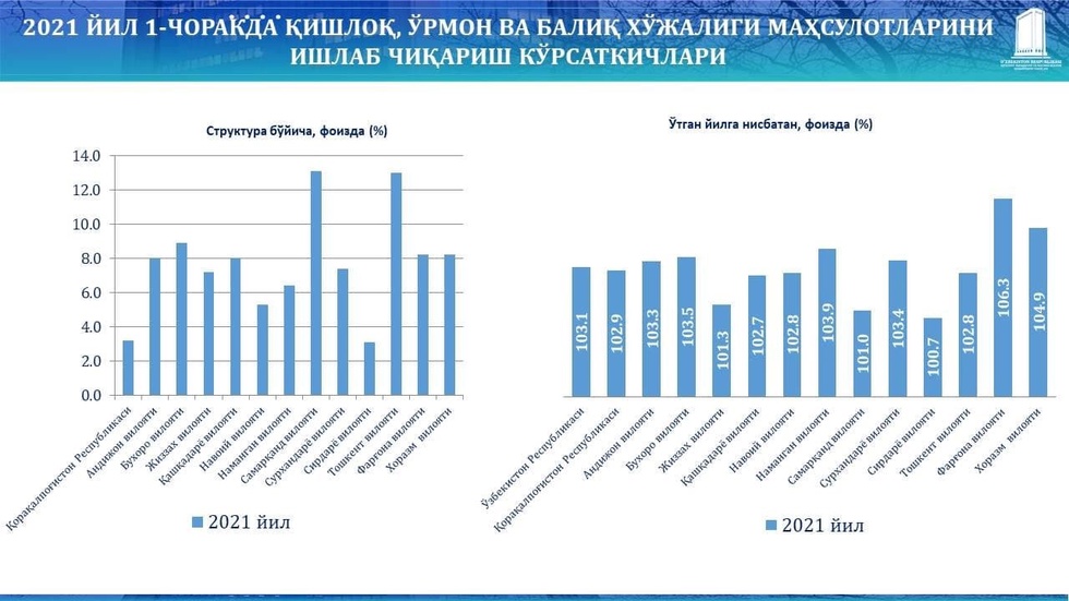 Qishloq, oʻrmon va baliq xoʻjaligi mahsulotlarini ishlab chiqarish hajmida Samarqand va Toshkent viloyatlarining ulushi yuqori boʻlib, respublika koʻrsatkichidagi xissasi 13,0 foizni, Buxoro, Fargʻona, Xorazm, Andijon, Qashqadaryo viloyatlari 8,0-8,9 foizni tashkil etmoqda. Shuningdek, Namangan (6,4%), Navoiy (5,3%), Sirdaryo (3,1%) viloyatlari va Qoraqalpogʻiston Respublikasining (3,2%) ulushi boshqa hududlarga nisbatan past ulushga ega.