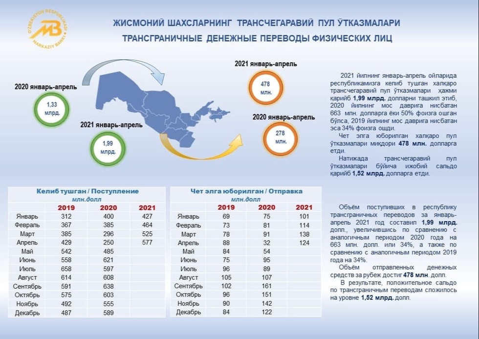 Markaziy bank maʼlumotlariga koʻra, 2021-yilning yanvar-aprel oylarida Oʻzbekistonga kelib tushgan xalqaro transchegaraviy pul oʻtkazmalari hajmi deyarli 1,99 mlrd dollarni tashkil etib, 2020-yilning mos davriga nisbatan 663 mln dollarga (50% foizga) oshdi.