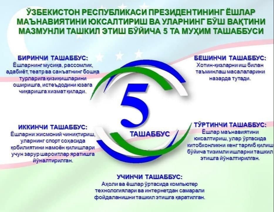 - Besh muhim tashabbus dastlab Toshkent viloyatining Boʻka tumani va Toshkent shahrining Uchtepa tumanida tajriba sifatida joriy etildi, – deydi Yoshlar ishlari agentligi Markaziy apparatining besh tashabbus loyihalarini muvofiqlashtirish boshqarma boshligʻi Mansur Masharipov. — 42 ta tuman va shaharlarning 168 ta olis va ogʻir ahvoldagi mahalla fuqarolar yigʻinlarida bu tajriba muvaffaqiyatli amalga oshirildi. Shuningdek, birinchi tashabbus – yoshlarning musiqa, rassomchilik, adabiyot, teatr va sanʼatning boshqa turlariga qiziqishlarini oshirish boʻyicha yurtimizdagi mavjud 800dan ortiq madaniyat markazlarida 4522 ta toʻgarak faoliyati yoʻlga qoʻyilib, ularga 1762 ta musiqa jihozi yetkazib berilgan. Umumtaʼlim maktablarida tashkil etilgan 36503 ta toʻgarakka 1 million nafardan ortiq yoshlar qamrab olingan. Umumtaʼlim maktablarida tasviriy sanʼat va musiqa yoʻnalishidagi 36 503 ta toʻgaraklarga 1,1 mln.nafar (18%) oʻquvchi-yoshlar jalb qilingan. 3 mingdan ortiq musiqa jihozlari yetkazib berilgan.