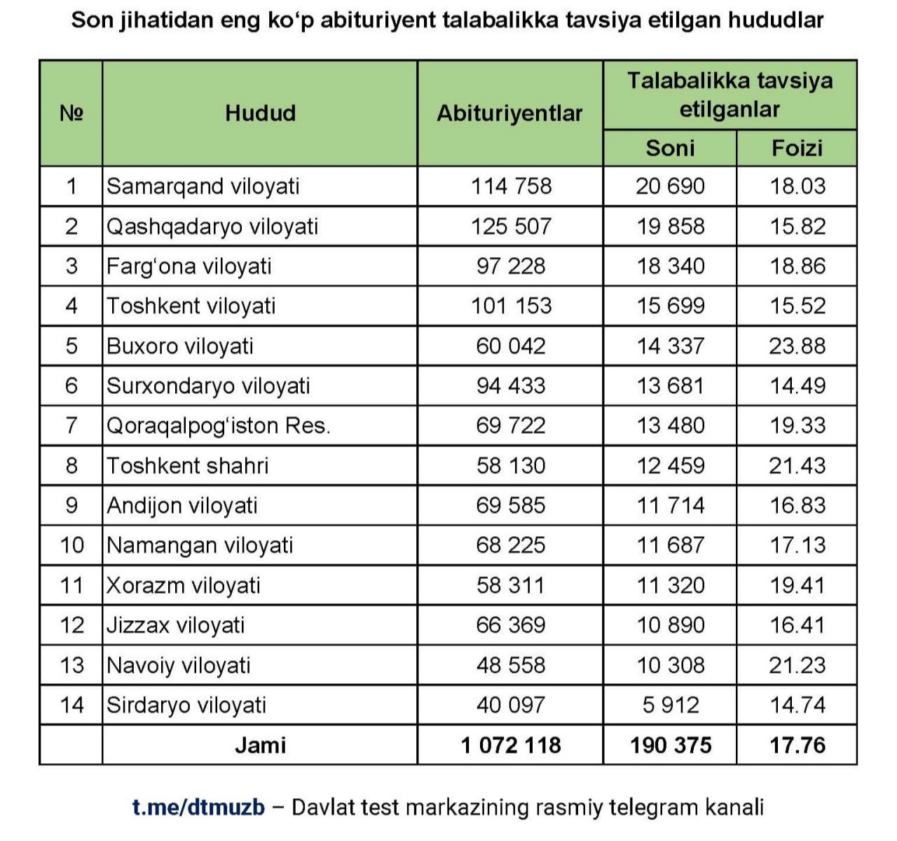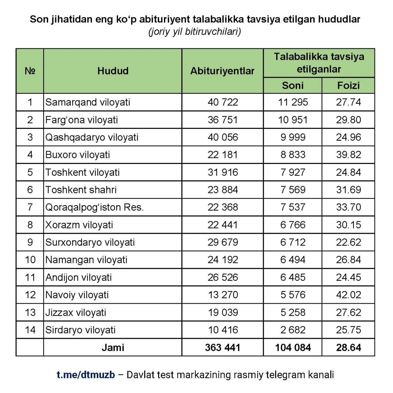 Jami abituriyentlar soniga nisbatan foiz hisobida eng yuqori natija (23,88%) Buxoro viloyatiga toʻgʻri keladi.