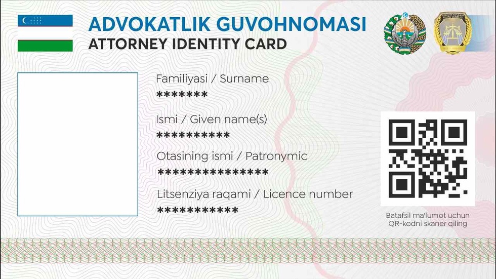 Advokatlik guvohnomasi QR-kod qoʻyilgan ID card shaklida rasmiylashtiriladi.