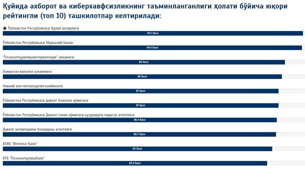 Axborot va kiberxavfsizlik boʻyicha Oʻzbekistondagi yetakchi tashkilotlar reytingi eʼlon qilindi