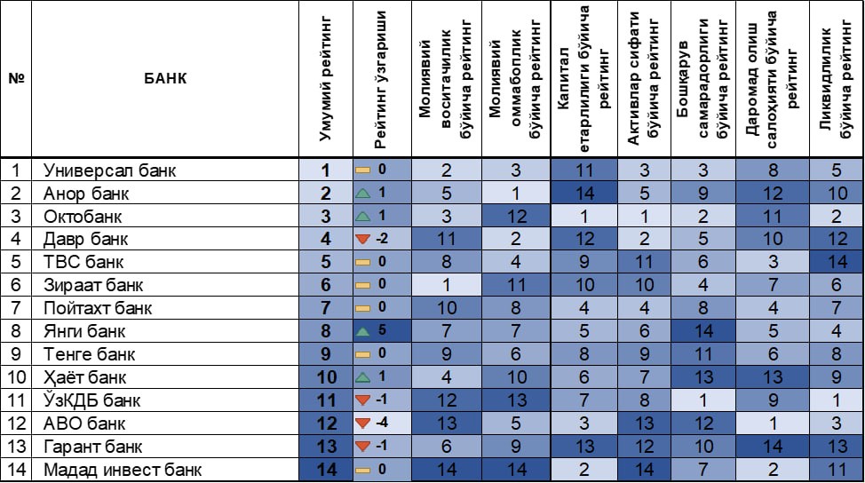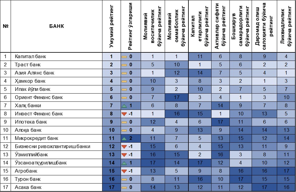 Yirik banklar reytingida Top-6 bank — “Kapitalbank”, “Trastbank”, “Aziya Alyansbank”, “Hamkorbank”, “Ipak yo'li bank”, “Orient finansbank” o'z o'rinlarini saqlab qoldi. “Mikrokreditbank” joriy chorakda eng yaxshi natijani ko'rsatib, o'z pozitsiyasini birdaniga ikki pog'onaga yaxshiladi va reytingda 11-o'rinni egalladi. “O'zsanoatqurilishbank” moliyaviy ommaboplik bo'yicha va aktivlar sifati bo'yicha 1 pog'onaga, likvidlilik bo'yicha birdaniga 3 pog'onaga ko'tarilgani sababli umumiy reytingda o'z o'rnini 1 pog'onaga yaxshilagan.