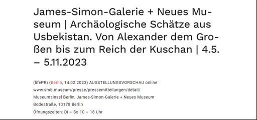 Germaniyaning “lifepr.de” yangiliklar portalida «O‘zbekiston arxeologik xazinalari – Aleksandr Makedonskiydan Kushonlar davrigacha» sarlavhali maqola eʼlon qilindi. Unda joriy yilning 4 mayidan 5 noyabriga qadar Berlinda «O‘zbekiston arxeologik xazinalari – Aleksandr Makedonskiydan  Kushonlar davrigacha» nomli ko‘rgazma bo‘lib o‘tishi maʼlum qilingan. «Tadbir Berlin davlat muzeylari tomonidan O‘zbekiston Sanʼat va madaniyatni rivojlantirish jamg‘armasi bilan o‘zaro hamkorlikda tashkil etilmoqda», deb yozadi manba.