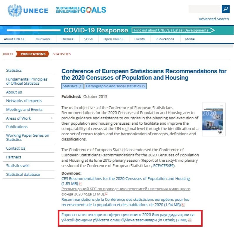 Davlat statistika qoʻmitasining tomonidan “Yevropa Statistiklar Konferensiyasining 2020-yil raundida aholi va uy-joy fondini roʻyxatga olish boʻyicha tavsiyalari” oʻzbek tiliga tarjima qilindi hamda Birlashgan Millatlar Tashkilotining Yevropa Statistiklar Konferensiyasining rasmiy veb saytida joylandi.