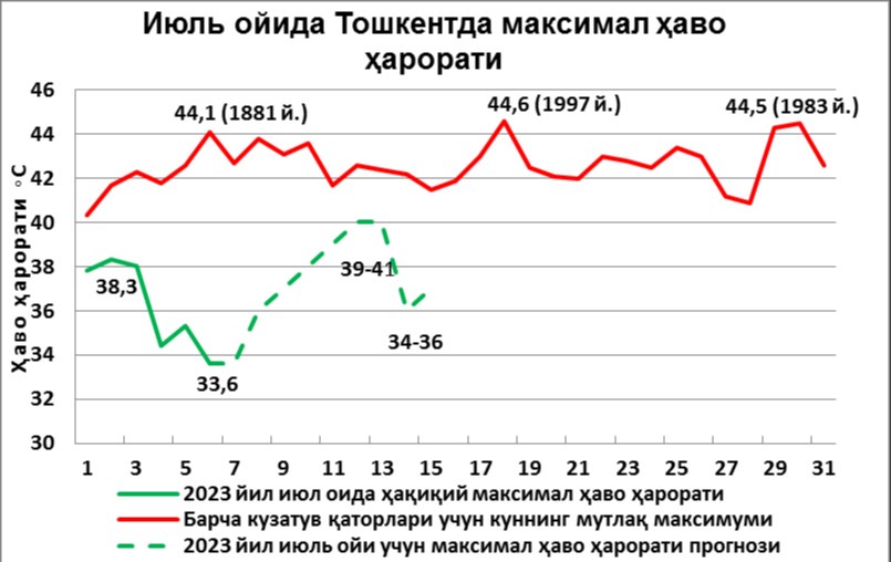 Issiq ob-havoning choʻqqisi 11-13-iyul kunlariga toʻgʻri keladi. Kunduzi havo harorati 39-42 darajagacha, janubda va choʻl hududlarda baʼzi joylarda 43-45 darajagacha koʻtariladi.