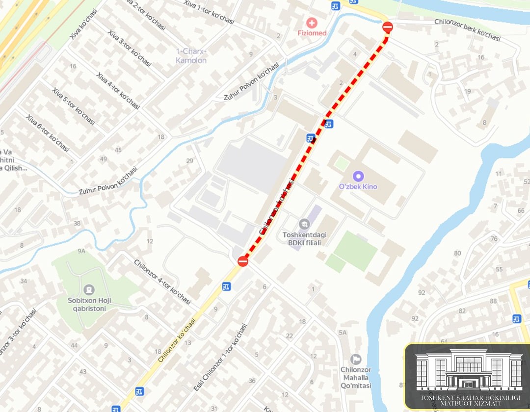 — Chilonzor koʻchasi – Novza va Katta Chilonzor koʻchalari oraligʻida soat 10:00 dan 17:00 gacha qisman yopiladi;