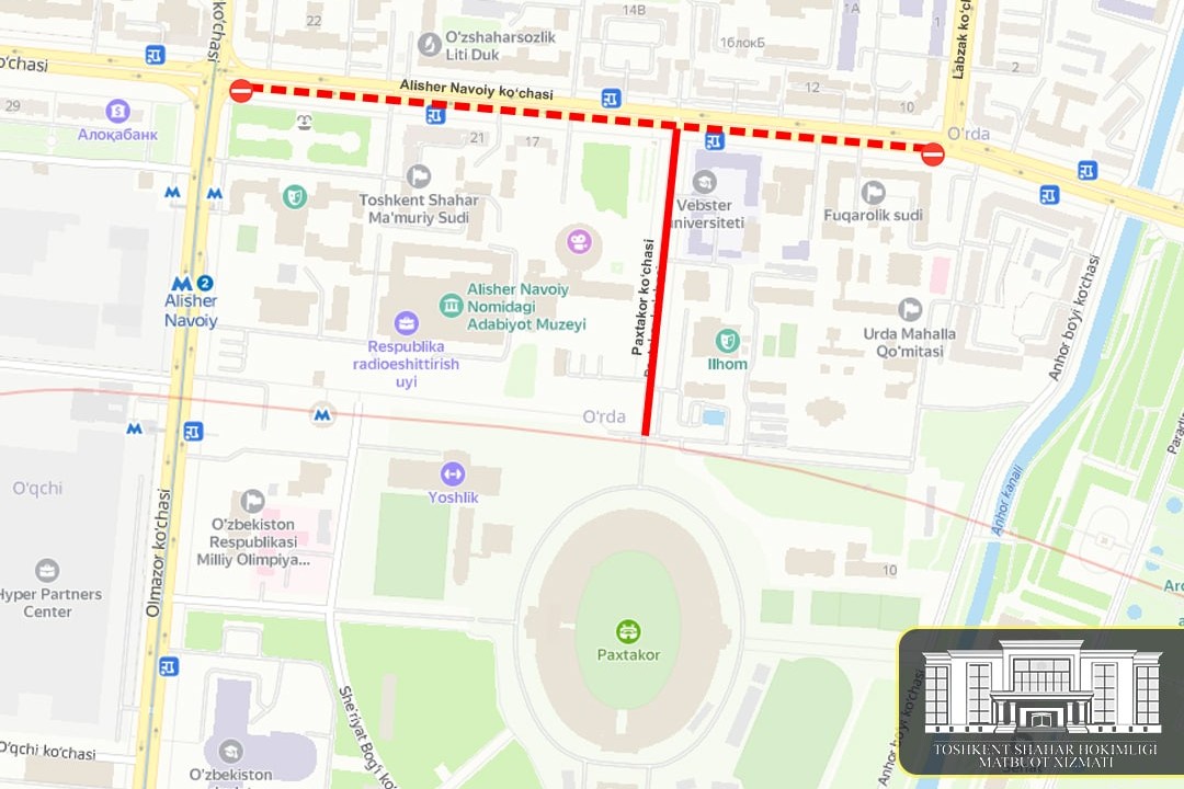 — Paxtakor koʻchasi – Navoiy shohkoʻchasi va “Paxtakor” stadioni oraligʻida soat 14:00 dan 23:00 gacha toʻliq yopiladi;