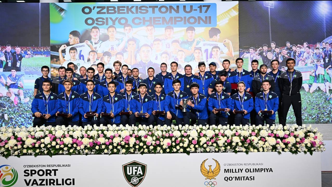 Shuningdek, tantanali marosim doirasida Prezidentimizning Farmonlariga binoan oʻsmirlar terma jamoasi futbolchilari va bosh murabbiyiga Davlat mukofotlari hamda mamlakatimizda ishlab chiqarilgan avtomobillar topshirildi.