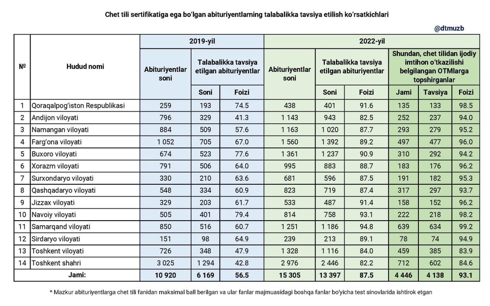 2019-yilda chet tili sertifikatiga ega 10 920 nafar abituriyentning 6 169 nafari (56,5 %) talabalikka tavsiya etilgan boʻlib, bu 2022-yildagi koʻrsatkichdan 32 foizga kam.