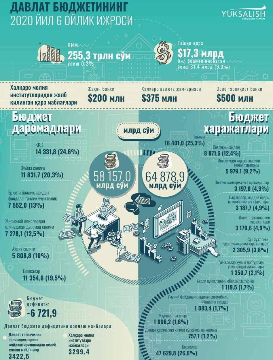 Davlat byudjetining daromadlari 2020-yilning birinchi yarmida koronavirus pandemiyasi tufayli ortib boruvchi xarajatlardan orqada qoldi. Birinchi yarim yillikda Davlat byudjeti defitsiti 6 721,9 mlrd soʻmni tashkil etdi.