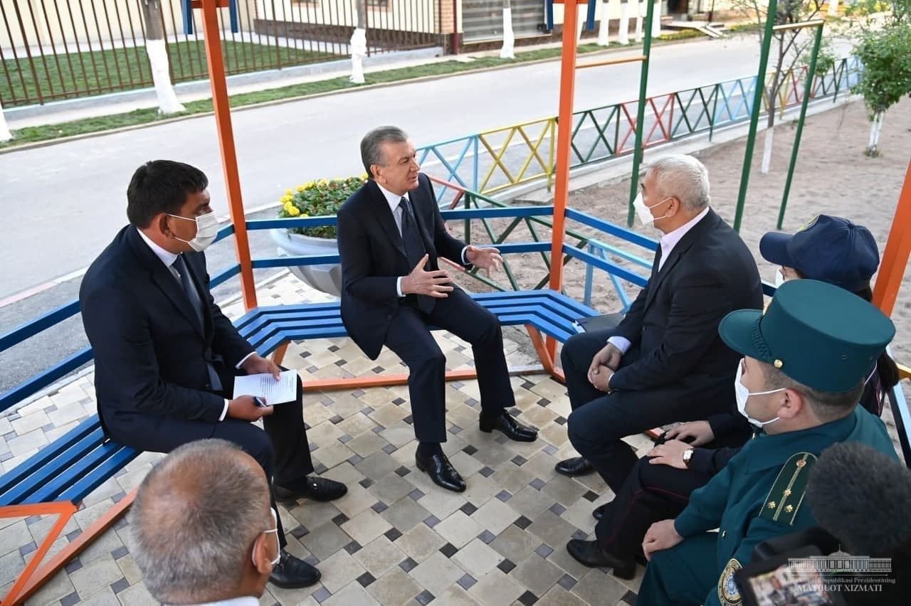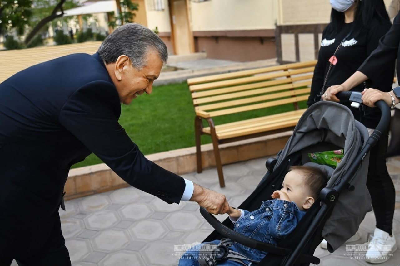 Hududda maktabgacha ta’lim muassasalari, maktab, sport maydonchalari bor. Prezident shu yerda o‘ynayotgan bolalarga ezgu tilaklar bildirdi.