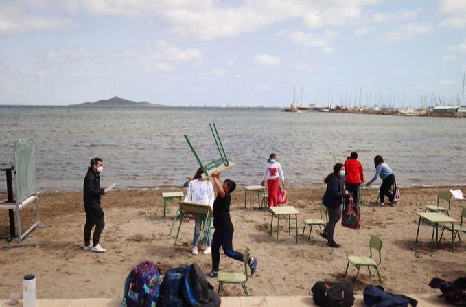Parta va sinf taxtasi qum ustiga oʻrnatilgan. Oʻquvchilar masofa saqlagan holda niqobda oʻtiradi. Darslar davomiyligi 20 daqiqani tashkil etadi.
