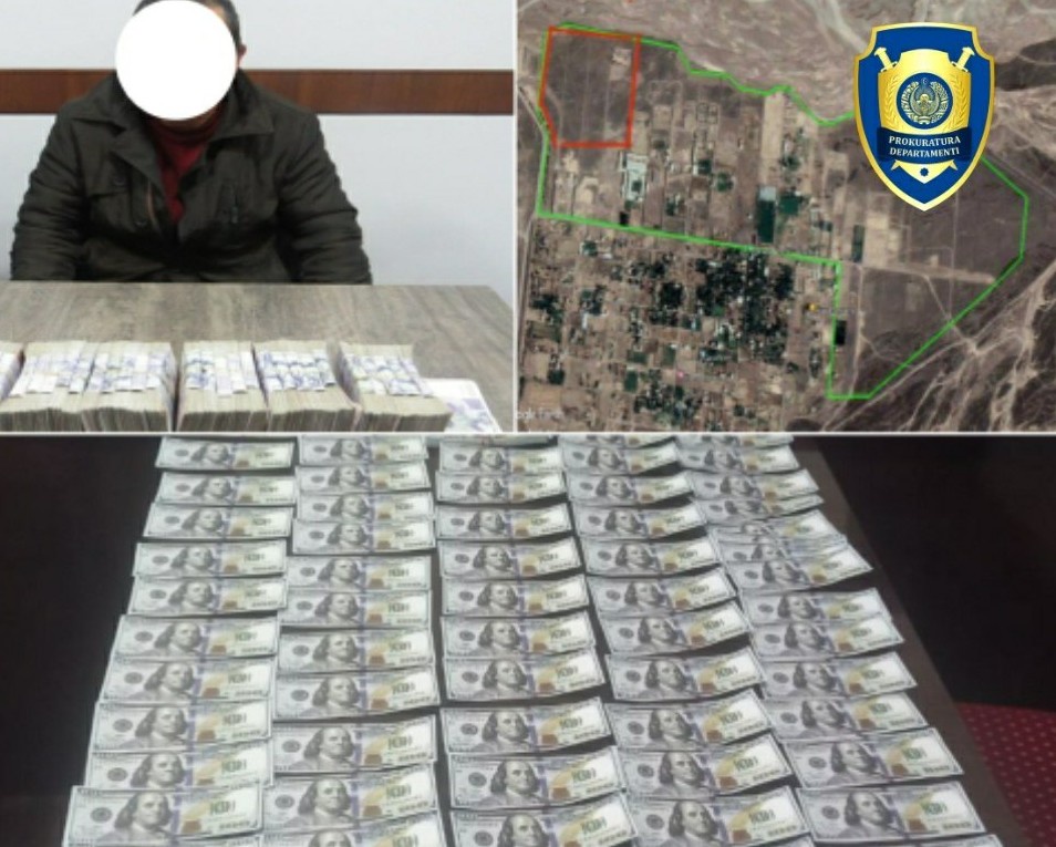 Bosh prokuratura huzuridagi Departament hamda IIB Jizzax viloyati boshqarmalari tomonidan oʻtkazilgan tezkor tadbirda, fuqaro A.O. Sharof Rashidov tumani “Tinchlik” MFY hududidagi oʻziga tegishli 6 sotix hamda 50 sotix zaxiradagi yer maydonini fuqaro M.M.ga 245 mln soʻmga sotishga kelishib, oldindan 145 mln soʻmni olgan vaqtida ashyoviy dalillar bilan ushlangan.