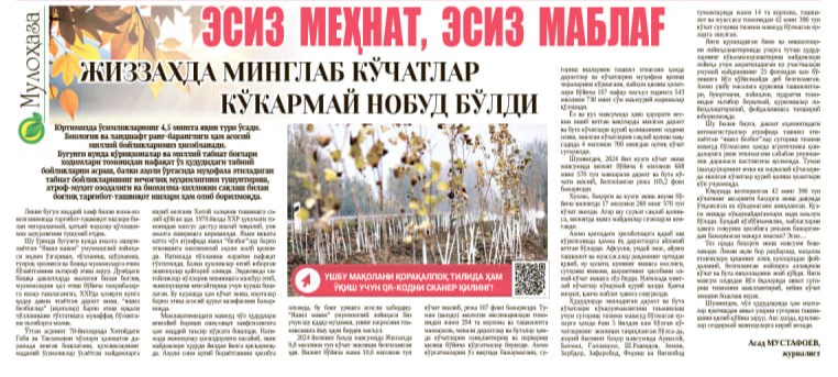 2024-yilning bahor mavsumida Jizzaxda 9,8 million tup koʻchat ekilishi belgilangan edi. Viloyat boʻyicha jami 10,6 million tup koʻchat ekilib, reja 107 foiz bajarildi. Tuman (shahar) ekologiya inspeksiyalari tomonidan jami 294 ta korxona va tashkilotga manzarali, mevali daraxtlar va butalar hamda koʻchatlarni oziqlantirish va parvarish qilish boʻyicha koʻrsatmalar berildi. Ammo koʻrsatmalarni oʻz vaqtida bajarmagani, sugʻorish ishlarini tashkil etmagani hamda daraxtlar va koʻchatlarni muhofaza qilish choralarini koʻrmagani, payhon qilish holatlari boʻyicha 167 nafar masʼul xodimga 543 million 730 ming soʻm maʼmuriy jarimalar qoʻllandi.