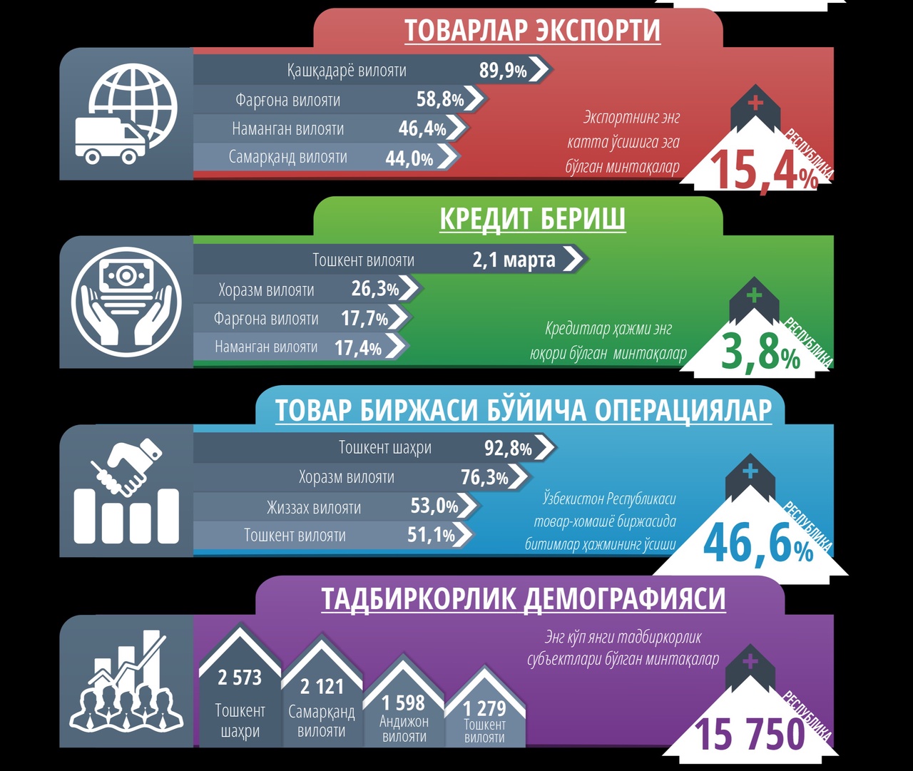 Bu davrda 15 750 ta yangi tadbirkorlik subʼektlari tashkil etilib, ularning eng koʼpi Samarqand (2 121), Аndijon (1 598), Toshkent (1 279), Fargʼona (1 207) viloyatlarida va Toshkent (2 573) shahrida roʼyxatga olingan.
