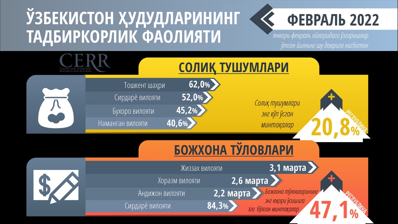 Shu bilan birga Sirdaryo (52%), Buxoro (45,2%), Namangan (40,6%), Fargʼona (40,4%), Qashqadaryo (39,8%) viloyatlarida va Toshkent shahrida (62%) soliq tushumlarining sezilarli oʼsishi qayd etildi.