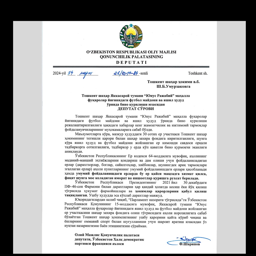 Oliy Majlis Qonunchilik palatasidagi partiyamiz fraksiyasi aʼzosi Firdavs Sharipov mazkur masala boʻyicha oʻz nuqtai-nazarini bayon etish yuzasidan Toshkent shahar hokimi (v.b) Sh.B.Umurzakovga deputatlik soʻrovi yubordi.