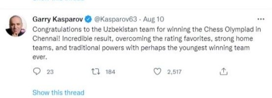 "O'zbekiston terma jamoasini Chennaydagi shaxmat Olimpiadasi g'olibligi bilan tabriklayman! eng yosh tarkib bilan reyting favoritlaridan o'zib ketish, mezbon jamoalardan kuchlilik qilish – qoyilmaqom natija", - deb yozgan Gasparov.