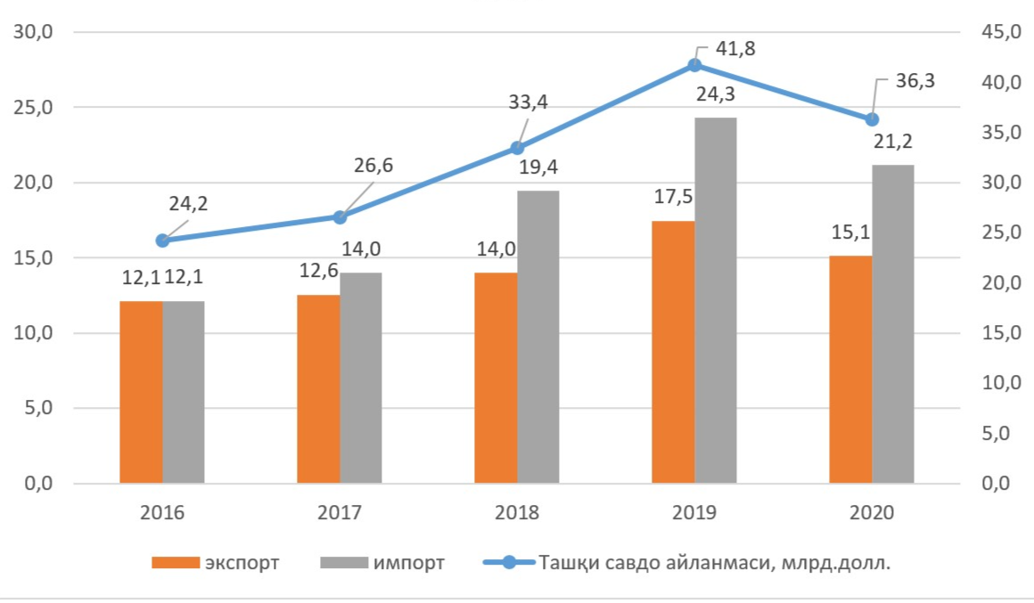 Tashqi savdoning liberallashtirilishi natijasida O'zbekistonning tashqi savdo aylanmasi hajmi 2020 yilda (2020 yildagi pandemiya oqibatlariga qaramay) 2016 yilga nisbatan 1,5 baravarga oshdi.