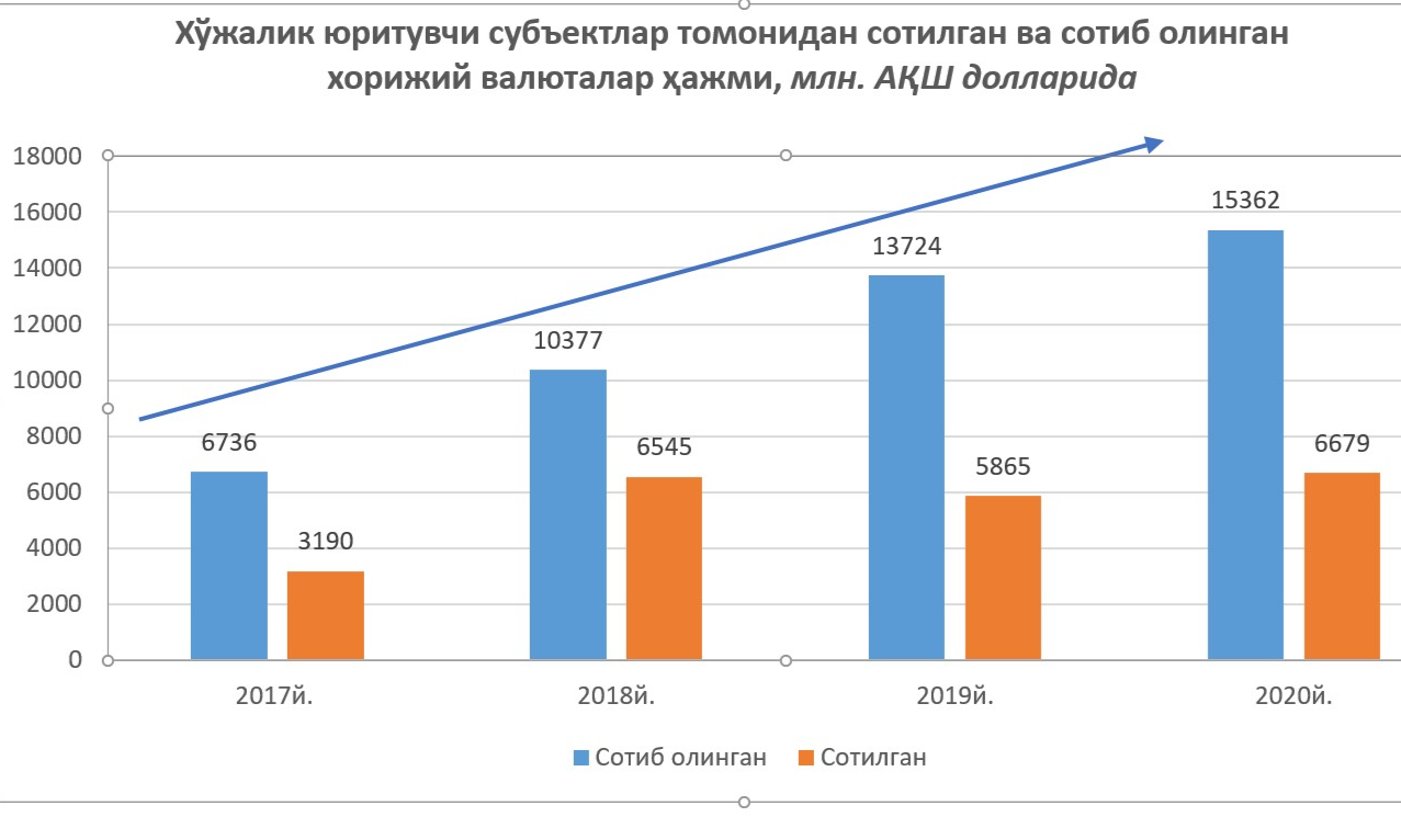 Valyuta siyosatini liberallashtirish natijasida 2017-2020 yillar davomida ichki valyuta bozorida xo'jalik yurituvchi sub'ektlar va aholi tomonidan xorijiy valyutani sotib olish va sotish operatsiyalari hajmi hamda valyuta bozori ishtirokchilari soni o'sishi kuzatildi. Xususan, xo'jalik yurituvchi sub'ektlar tomonidan sotib olingan jami valyuta hajmi 2020 yilda 2017 yilga nisbatan 2,3 barobarga, sotilgan valyuta hajmi esa 2,1 barobarga oshdi.